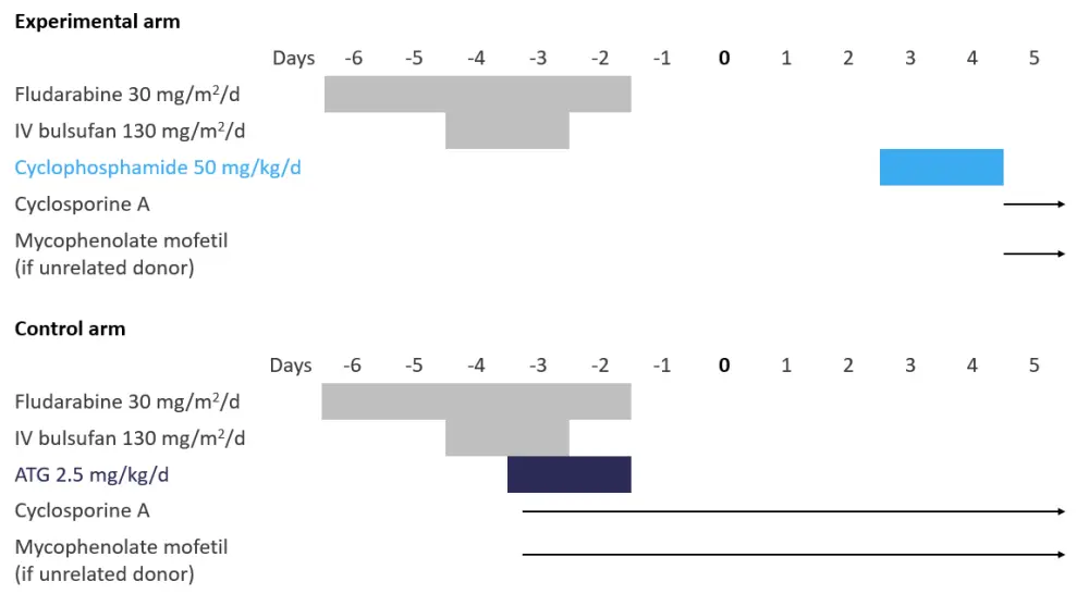 The treatment arms are detailed in Figure 1. All patients had availability of either a matched sibling or 10/10-matched unrelated donor and received a graft source of peripheral blood stem cells.