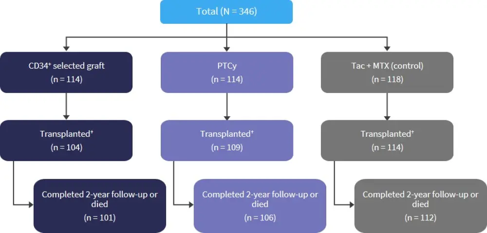 A total of 346 patients were enrolled, of which 327 underwent transplantation. The median age was 51 years (range, 13−66 years) and the median time from diagnosis to HSCT was 5 months (range, 1.3−231 months). Treatment non-compliance rates were 14.4%, 8.2%, and 2.6% in the CD34+, PTCy, and Tac + MTX arms, respectively. Patient characteristics are shown in Table 1.