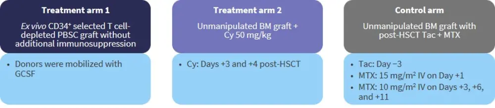 BM, bone marrow; Cy, cyclophosphamide; GCSF, granulocyte colony stimulating factor; HSCT, hematopoietic stem cell transplantation; IV, intravenous; MTX, methotrexate; PBSC, peripheral blood stell cell; Tac, tacrolimus.