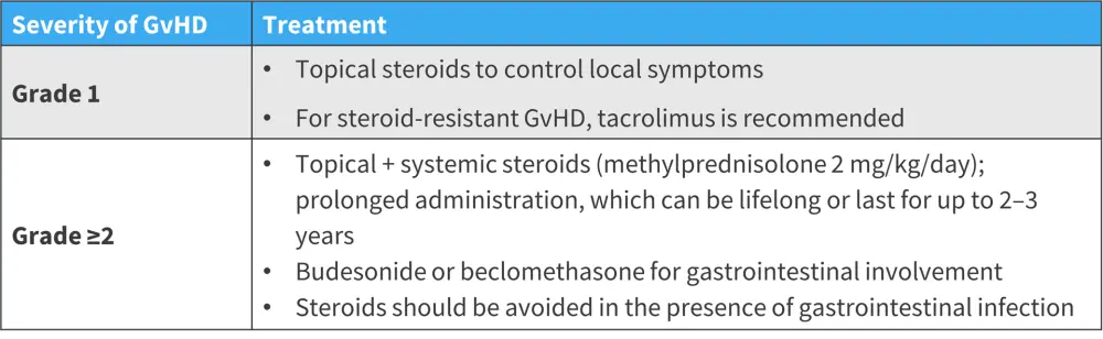 Treatments should focus on reducing the symptoms of GvHD while avoiding reducing the beneficial graft vs tumor response. The choice of treatment is based on the severity of symptoms and organ involvement. Figure 4 shows the criteria for treatment selection with corticosteroids.1