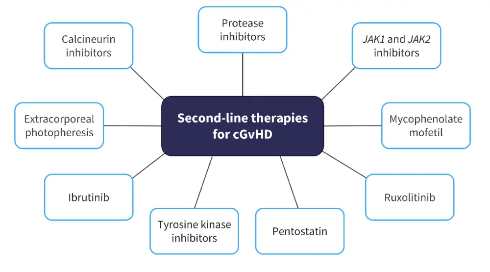The GvHD Hub has reported on developments in the management of cGvHD. Currently, there are no standard second-line therapies for GvHD, and institutional advice should be followed depending on the location of the center; second-line therapies available for cGvHD are outlined in Figure 5.