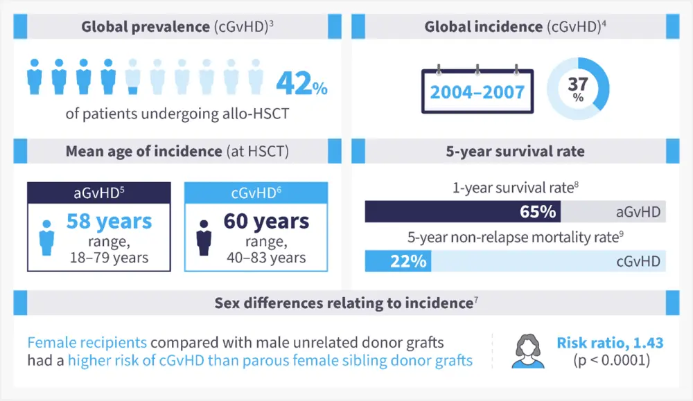 The occurrence of aGvHD in patients undergoing allo-HSCT from an human leukocyte antigen (HLA)-matched sibling ranges between 9% and 50%, with a higher occurrence in unmatched donors.2 Chronic GvHD occurs in 6–80% of patients and is one of the main causes of mortality following allo-HSCT (Figure 1).1, 3-9