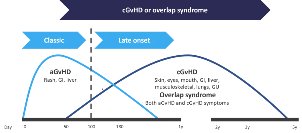 aGvHD is diagnosed in the first 100 days post hematopoietic stem cell transplantation (HSCT) and manifests without any signs or symptoms of cGvHD. Late-onset aGvHD is diagnosed after Day 100 and occurs within 1 year post transplant, again without any cGvHD symptoms. Overlap syndrome occurs in patients who experience both symptoms of aGvHD and cGvHD. Classic cGvHD can occur at any time following HSCT, without any of the symptoms of aGvHD.