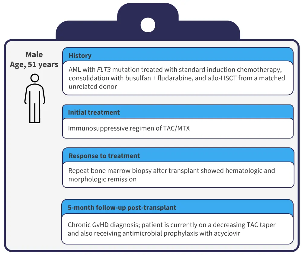 The patient is young and has developed moderate chronic GvHD with skin mucosal and ophthalmic involvement early post-allo-HSCT (5 months) during tapering of post-transplant immunosuppression. The patient has now failed to respond to 1 mg/kg steroid treatment alongside increased tacrolimus dosing (back to therapeutic levels).
