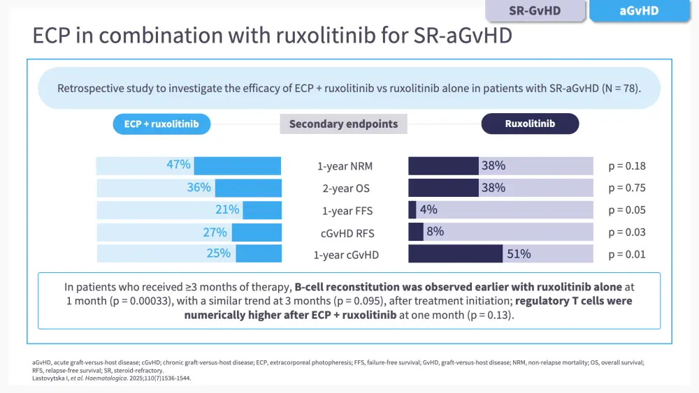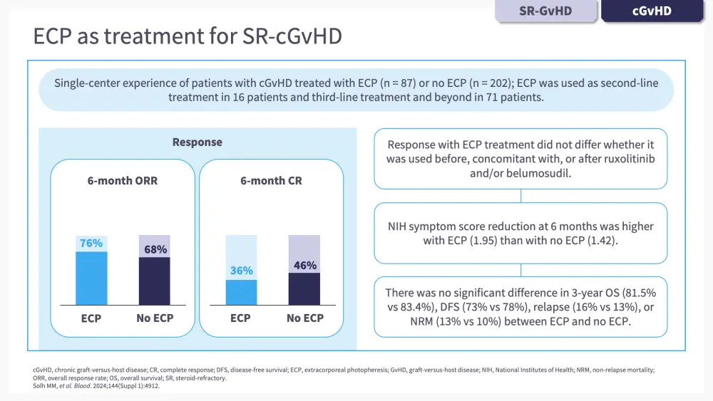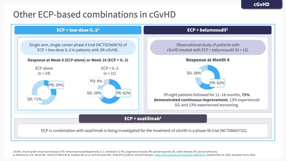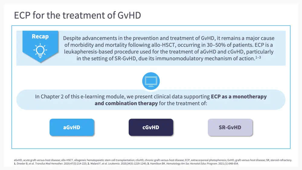In the second chapter of this e-learning module, we go through some of the clinical findings supporting the use of ECP either alone or in combination with other agents, including ruxolitinib, belumosudil, interleukin-2 (IL-2), and axatilimab, in patients with GvHD.