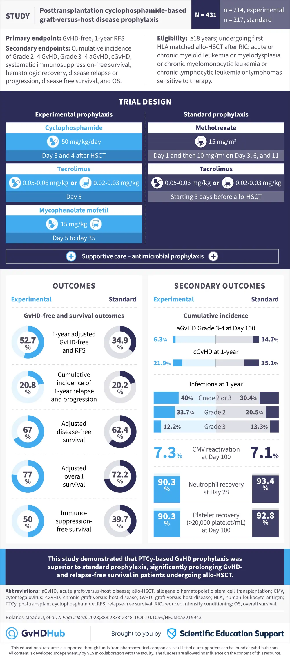 We are pleased to a present a visual abstract summarizing the results of a phase III trial (NCT03959241) comparing posttransplantation cyclophosphamide (PTCy) based GvHD prophylaxis versus standard prophylaxis in patients with hematologic malignancies, published by Bolaños-Meade et al.1 in The New England Journal of Medicine. The study demonstrated PTCy-based GvHD was superior to the standard GvHD prophylaxis with respect to GvHD-free survival and relapse-free survival in patients undergoing allogeneic hematopoietic stem cell transplantation.