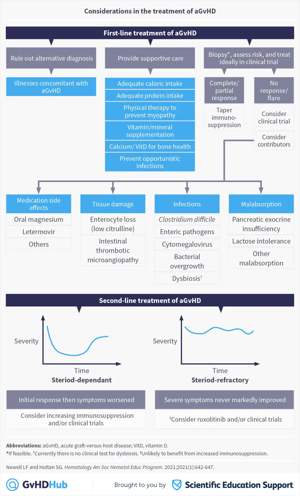 In a recent publication from the American Society of Hematology Education Program,1 Newell and Holtan discussed important factors to consider during the treatment of acute graft-versus-host disease (aGvHD), including risk-adapted treatment approaches and areas where treatment could be improved. The authors also highlighted the importance of considering the severity of patient symptoms, the possibility of alternative diagnoses and provision of supportive care before starting first-line therapy with corticosteroids. If a patient has persistent or recurring symptoms that occur after the initial treatment of aGvHD, then it is important to consider other contributors such as medication side effects, tissue damage, infections, and malabsorption, before starting second-line therapy.1