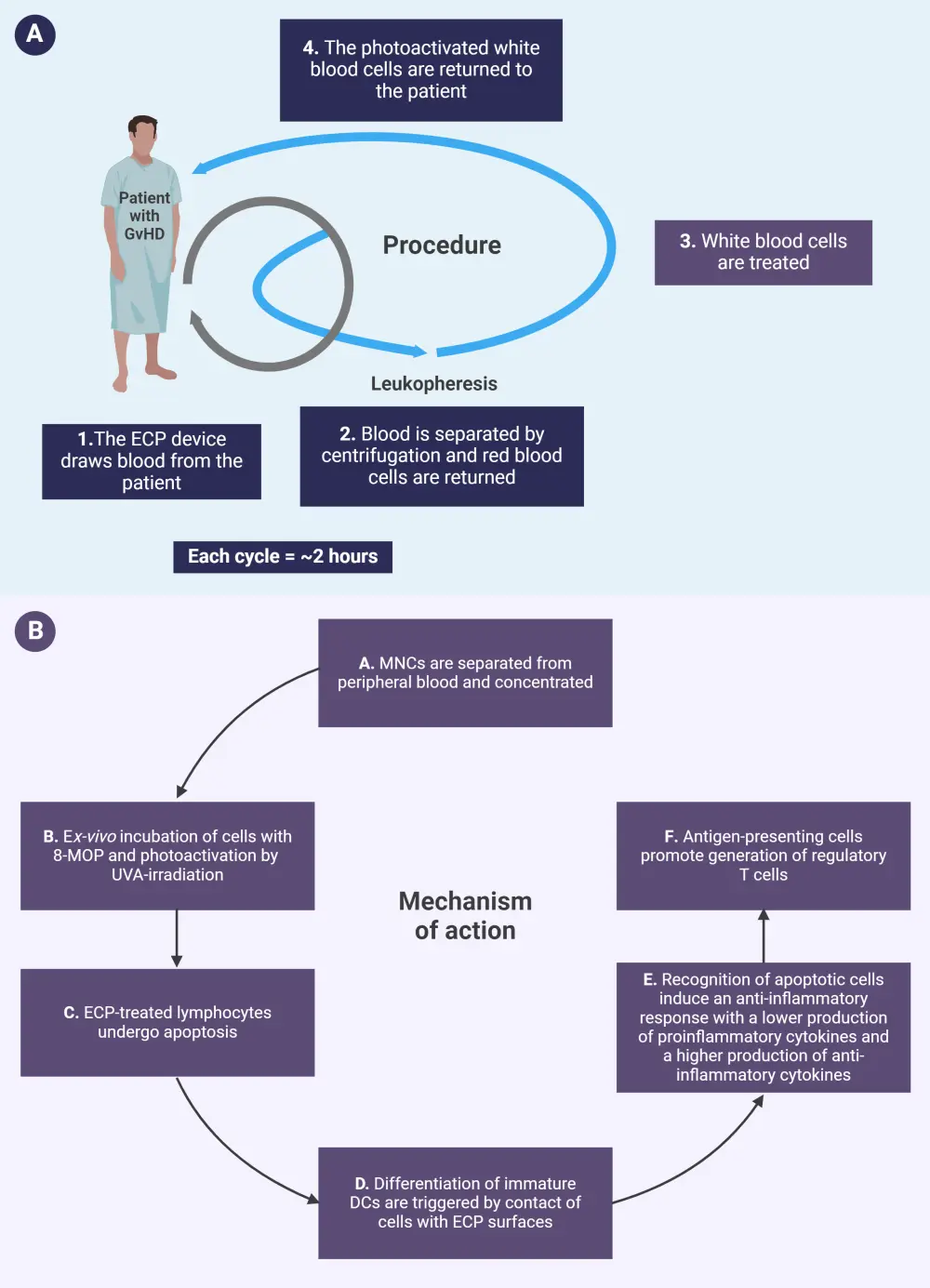 DC, dendritic cell; ECP, extracorporeal photopheresis; 8-MOP, 8-methoxypsoralen; MNC, mononuclear cell; UVA, ultraviolet-A.
