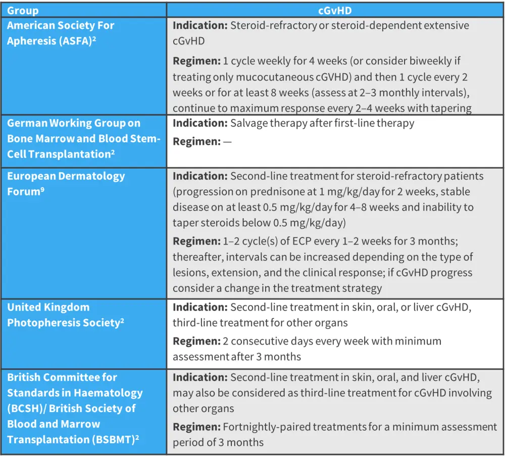 Most of the available data on the efficacy of ECP in cGvHD comes from uncontrolled clinical trials or retrospective studies.2 As a result, determining an ideal treatment schedule for cGvHD has not yet been established.2 Figure 2 summarizes varying recommendations for ECP regimens for the treatment of cGvHD by expert groups.