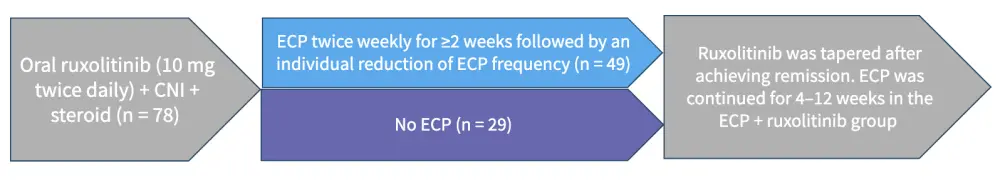 Limitations of this study include the retrospective and non-randomized nature; therefore, further studies of ECP + ruxolitinib could utilize a single- vs double-agent randomization approach.