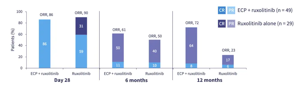 At Day 28, the CR rate was higher in the ruxolitinib group vs ECP + ruxolitinib. However, at Months 6 and 12, response rates were higher for ECP + ruxolitinib compared with ruxolitinib alone (Figure 2)5.