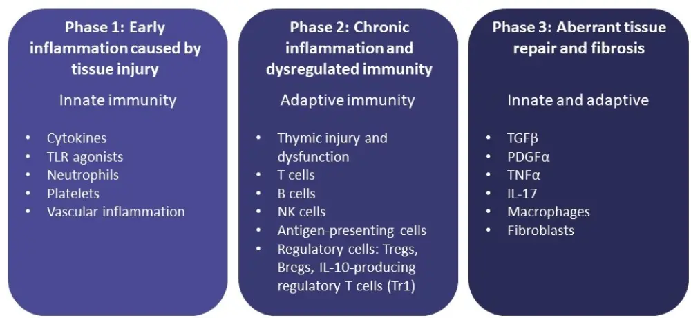 The proposed mechanism for the initiation and development of cGvHD involves early inflammation caused by tissue injury, dysregulated immunity, and aberrant tissue repair and fibrosis (Figure 1).4