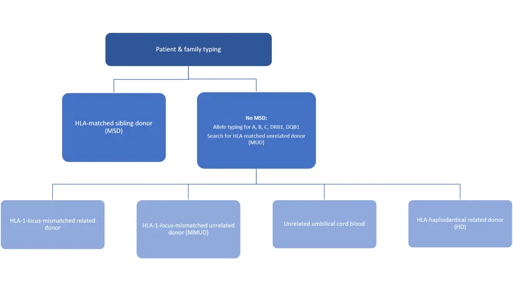 HLA-matched sibling donors are the ideal donors, but they are only available in approximately 30% of cases.1 The next best option is an HLA-matched unrelated donor (MUD), which is also not always available, especially for patients of non-European background2, leading to the choice between HLA-mismatched related or unrelated donors (MMUD), HLA-haploidentical (HD) donors, or umbilical cord blood (Figure 1).3,4