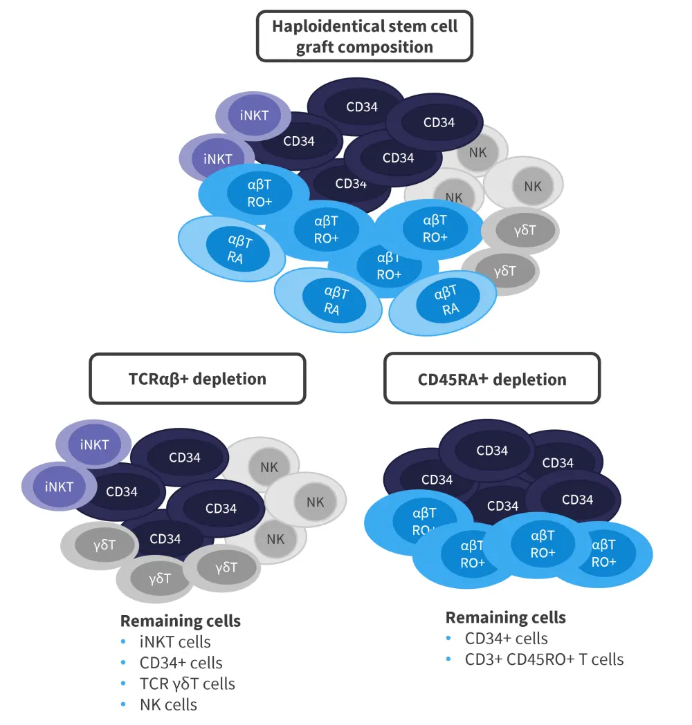 While bone marrow transplantation can be of great benefit for both patients with malignant and nonmalignant hematologic disorders, the issue of finding a suitable donor remains. Haploidentical donors are accessible for most patients; however, they are associated with a high level of GvHD when the cells are given in an unmanipulated form. T-cell depletion strategies can allow haploidentical donors to be used without significant morbidity and mortality in patients. This article focuses on CD45RA+ depletion and αβ+ T-cell receptor (TCR)/CD19+ depletion in pediatric patients who have received a hematopoietic stem cell transplant (HSCT), as shown in Figure 1.