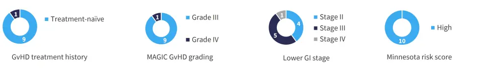A total of ten patients were enrolled in the study, with median age of 63 (range, 51–72 years). The median time from hematopoietic stem cell transplant to GvHD was 85 days. The key baseline characteristics at enrollment are shown in Figure 2.