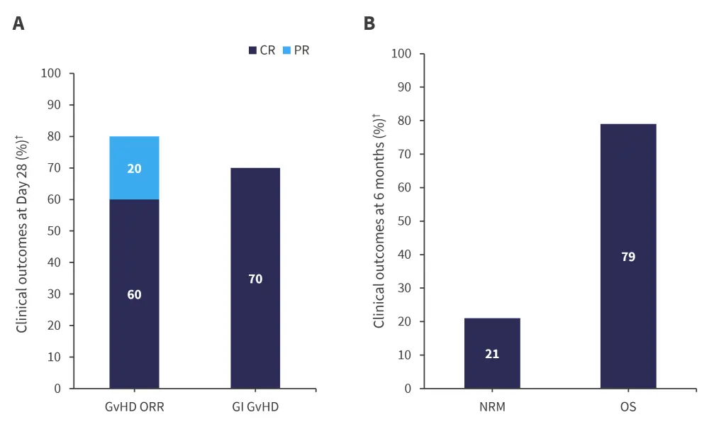 Figure 3. Key secondary endpoints: A GvHD and GI GvHD ORR at Day 28 and B NRM and OS at 6 months*