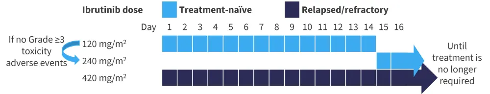 The recommended pediatric equivalent dose for patients aged <12 years and ≥12 years was 240 mg/m2 daily and 420 mg/m2 daily, respectively. The plasma concentration-time profile of ibrutinib in both younger and older children was consistent with those of adult patients with cGvHD.