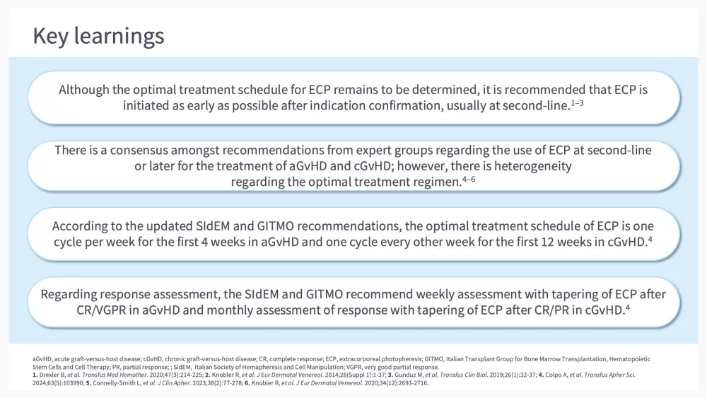 There is heterogeneity between treatment centers regarding extracorporeal photopheresis (ECP) scheduling, and the optimal treatment schedule for ECP in graft-versus-host disease (GvHD) is yet to be determined.