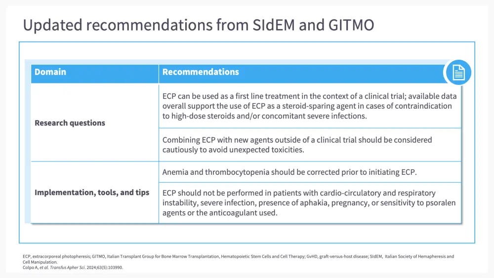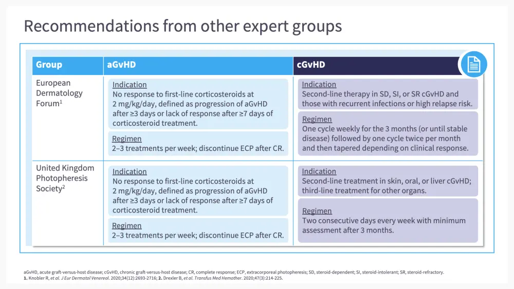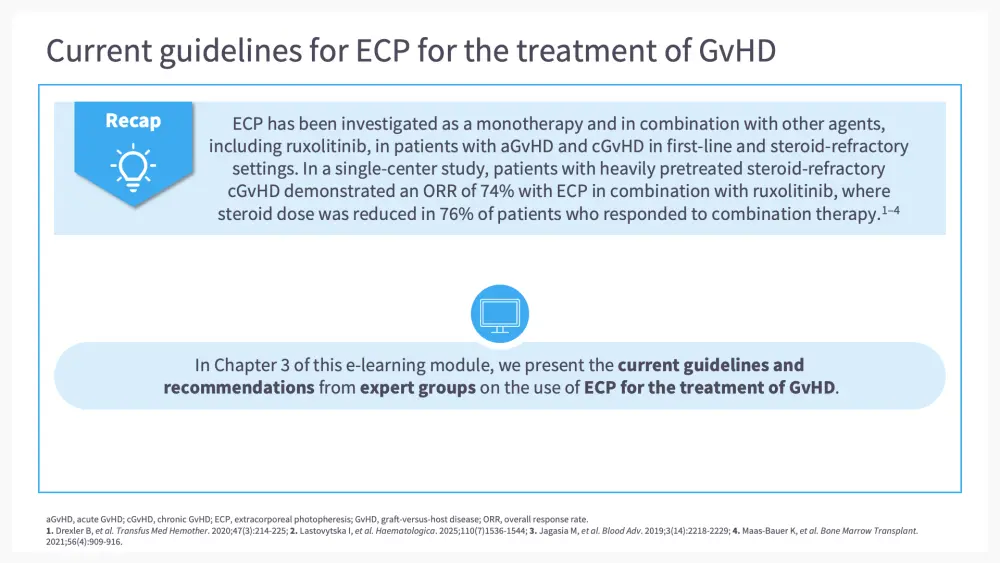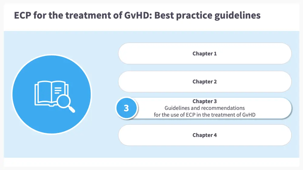 In the third chapter of this e-learning module, we provide an overview of the current guidelines and latest recommendations from expert groups, including the American Society for Apheresis (ASFA), alongside multiple European groups from Italy, Germany, and the UK, for the use of ECP for the treatment of acute and chronic GvHD.