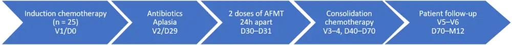 A phase II, single-arm, multicenter, prospective trial in hospitalized patients with AML or high-risk myelodysplastic syndrome (MDS) (n = 25) who received induction chemotherapy (IC). AFMT was planned at the end of IC, after aplasia completion (absolute neutrophil count [ANC] >0.5 G/L) and 24 hours after antibiotics discontinuation, as shown in Figure 1.