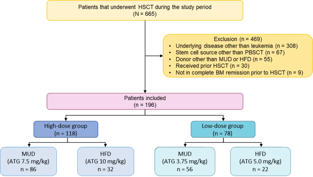 In a cohort of pediatric patients undergoing allo-PBSCT for the treatment of leukemia, those who received low doses (3.75–5.0 mg/kg) of ATG demonstrated superior treatment outcomes when compared with those treated with higher ATG doses (7.5–10.0 mg/kg). Higher doses of ATG were also coupled with a significant increase in the rates of viral and bacterial infections and exhibited no benefit over low-dose ATG in preventing the incidence and severity of GvHD.
