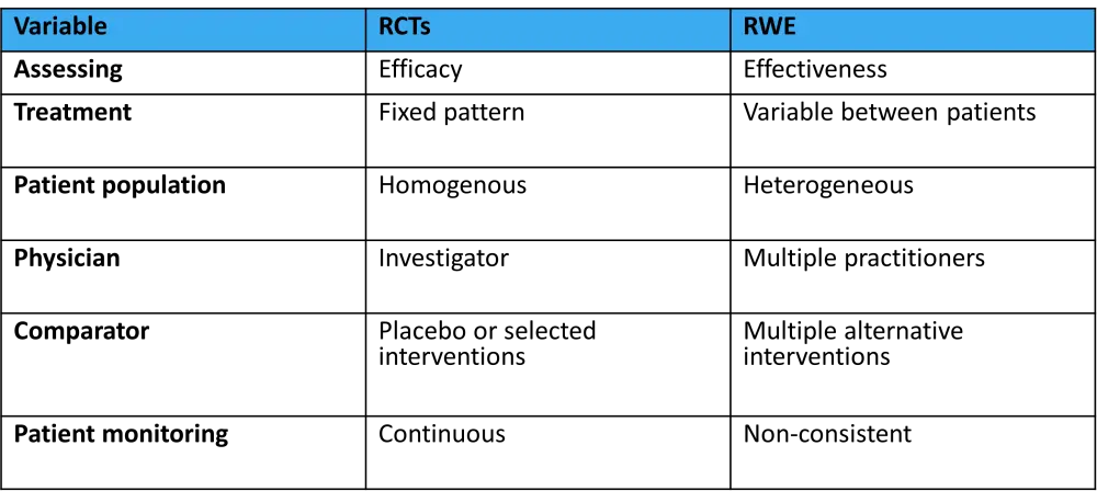 Ideally, RCTs and real-world studies should be developed to be complementary. For example, if an RCT investigates the efficacy of a drug, the real-world studies can focus on the epidemiology, effectiveness, safety, or costs of treatment related to that drug (Table 1).1