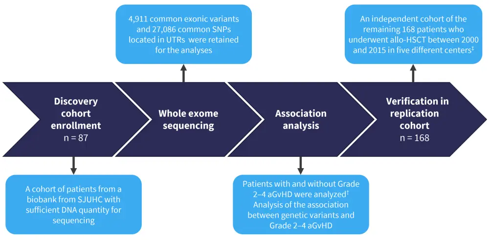 aGvHD, acute graft-versus-host disease; allo-HSCT, allogeneic hematopoietic stem cell transplantation; SJUHC, Sainte Justine University Health Center; SNP, single nucleotide polymorphism; UTR, untranslated region.