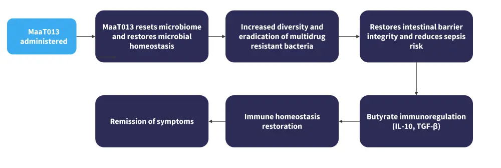 In steroid and ruxolitinib refractory patients (n = 31) who were treated with MaaT-013 as a third-line therapy, 55% and 49% of patients survived to 6 and 12 months, respectively. Overall survival in patients that responded was 74% at both timepoints compared with 15% survival in non-responders at 6 months and 0% at 12 months.