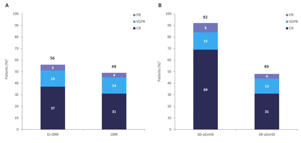 aGvHD, acute graft-versus-host disease; CR, complete response; GI-ORR, gastrointestinal overall response rate; PR, partial response; SD, steroid dependant; SR, steroid resistant; VGPR, very good partial response.