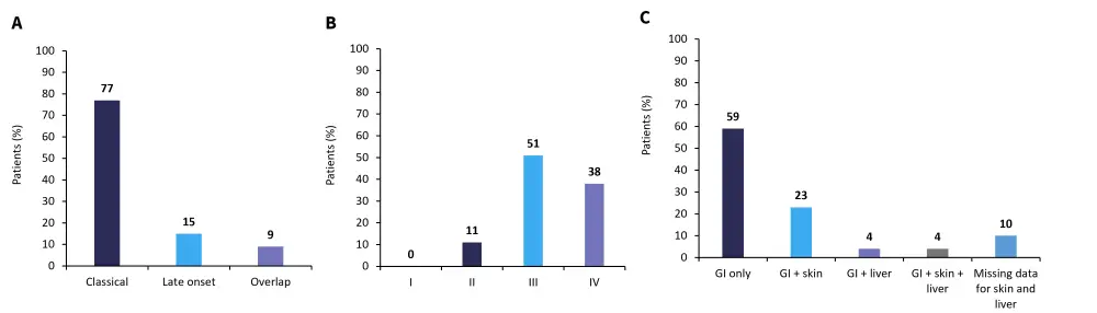 Figure 2. A type of GvHD, B aGvHD grade at time of ATU request, and C GvHD organ involvement at inclusion*