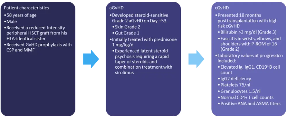 aGvHD, acute GvHD; ANA, antinuclear antibody; ASMA, anti-smooth muscle antibody; cGvHD, chronic GvHD; CMV, cytomegalovirus; CSP, cyclosporine; GvHD, graft-versus-host disease; HLA, human leukocyte antigen; HSCT, hematopoietic stem cell transplant; Ig, immunoglobulin; MMF, mycophenolate mofetil; P-ROM, photographic range of motion scale.