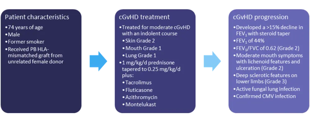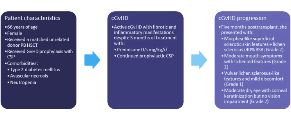 Chronic graft-versus-host disease (cGvHD) occurs in ≥30% of patients who survive ≥100 days following allogenic hematopoietic stem cell transplantation, and the complex and multifactorial pathogenesis of cGvHD—a disease with significant patient burden and effect on quality of life—can make diagnosis and treatment difficult. Mild cGvHD is generally managed with topical steroids, while moderate to severe disease requires systemic corticosteroids with or without a calcineurin inhibitor; however, more than half of patients become either steroid-resistant or steroid-dependent.1