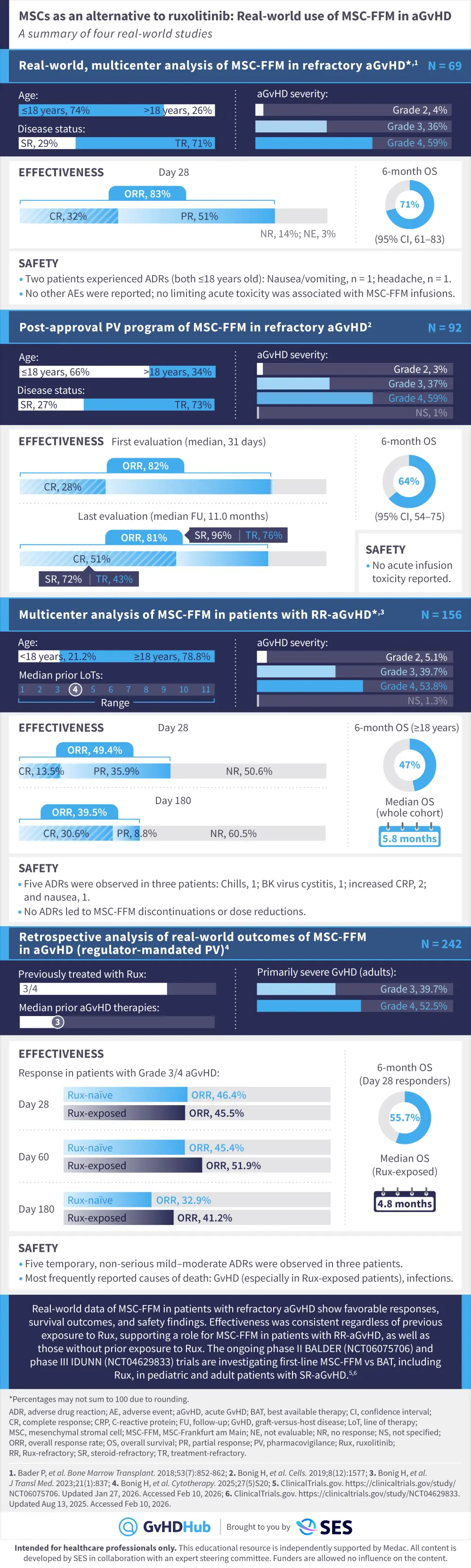 Mesenchymal stromal cells (MSCs) are an emerging treatment option for patients with treatment-refractory aGvHD. MSC-Frankfurt am Main (MSC-FFM), is an MSC preparation produced from bone marrow-derived mononuclear cells of eight donors, with real-world evidence supporting the effectiveness and tolerability of this approach in patients with aGvHD.3-6 This visual abstract summarizes four real-world studies on MSC-FFM in aGvHD, including both steroid- and ruxolitinib-refractory disease, as well as in patients without prior exposure to ruxolitinib.