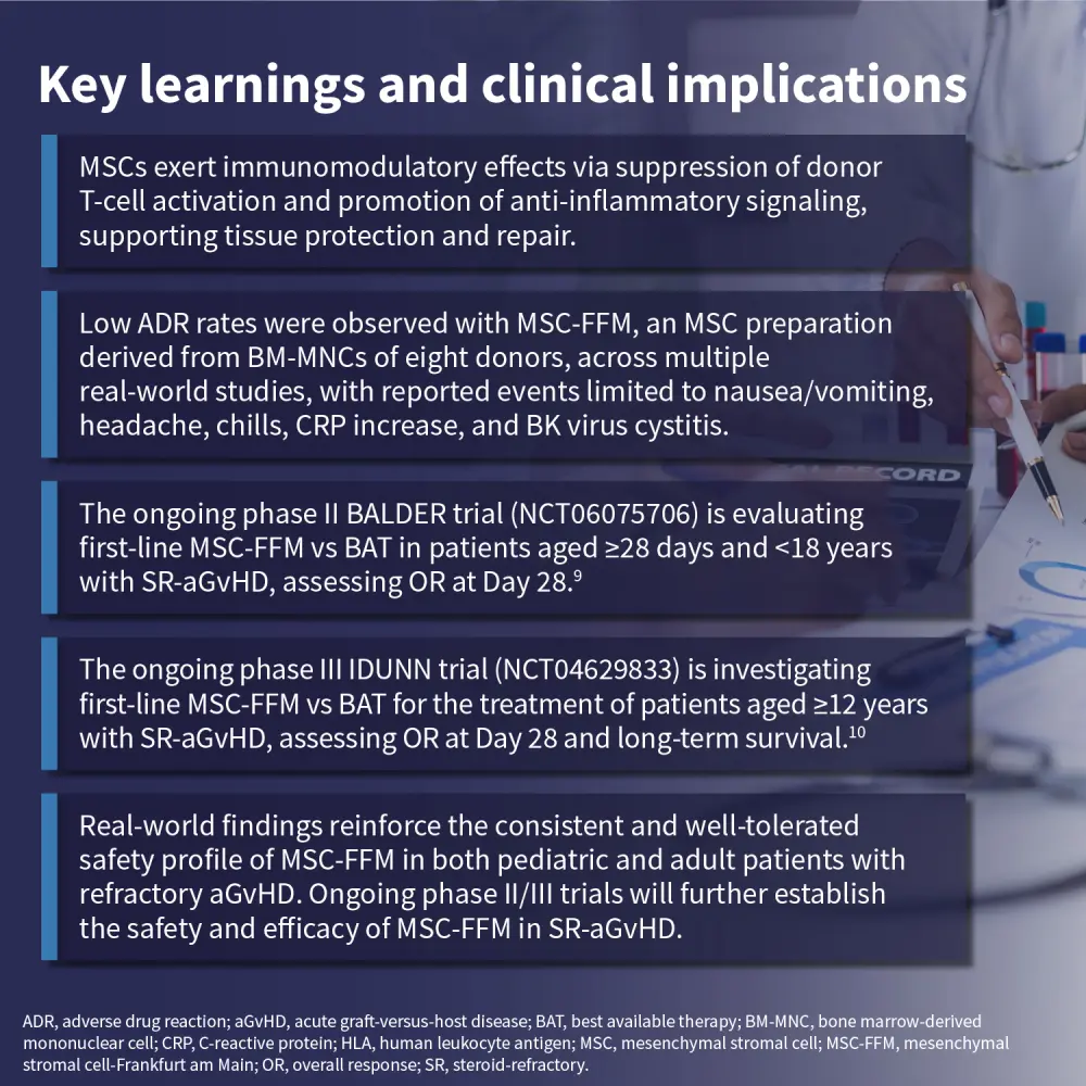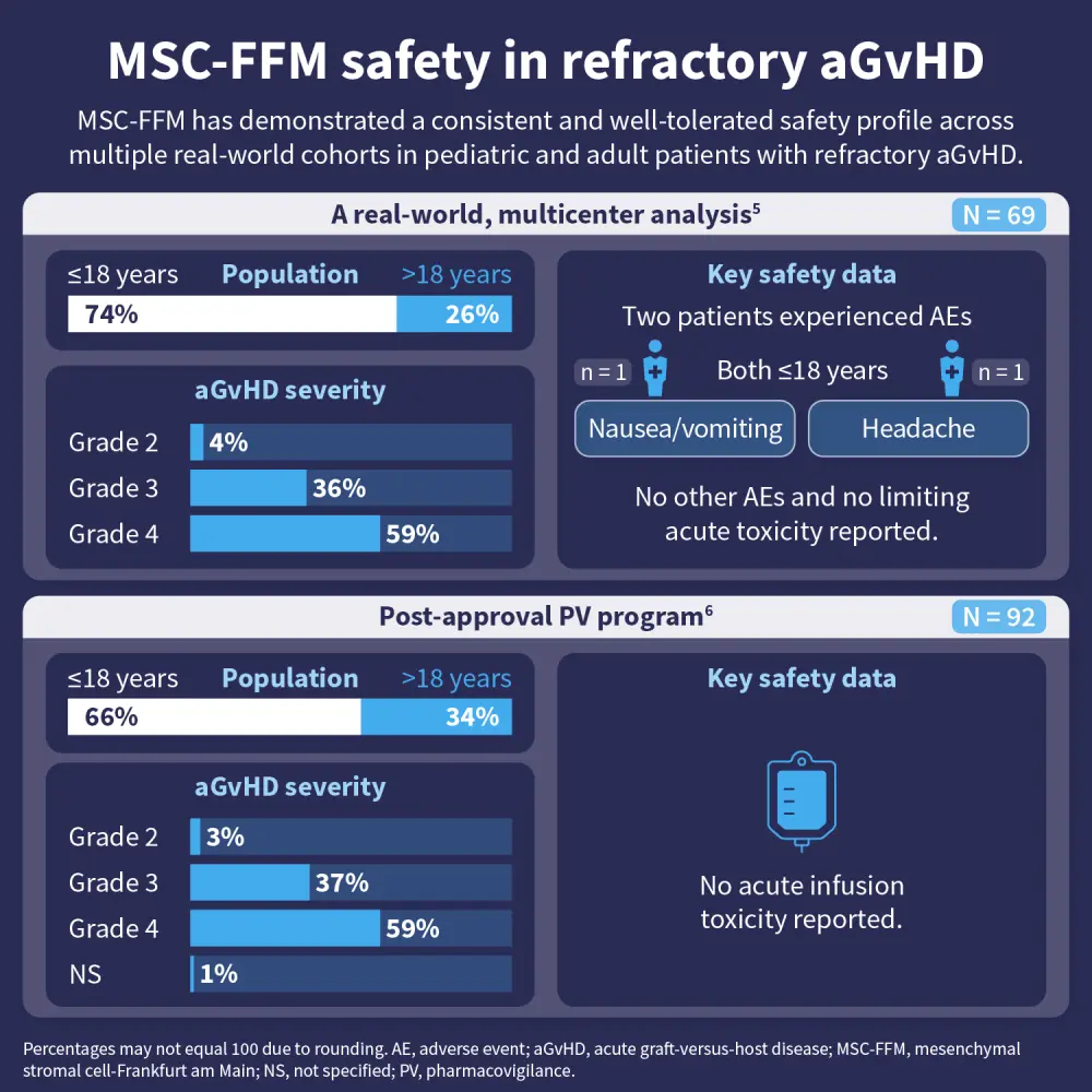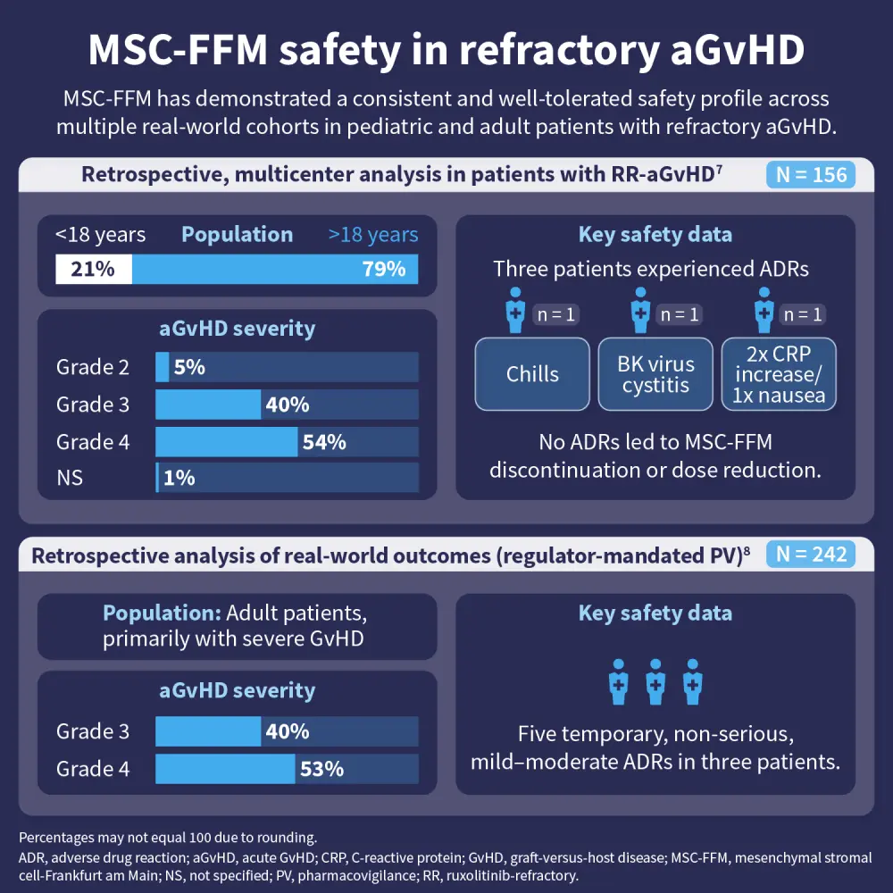 Graft-versus-host disease (GvHD) remains a major complication following allogeneic hematopoietic stem cell transplantation. Mesenchymal stromal cells (MSCs) have been studied as a potential therapy due to their immunomodulatory and anti-inflammatory properties. MSC-FFM, a standardized, pooled bone marrow-derived MSC product, has been evaluated in patients with refractory acute GvHD across multiple real-world cohorts.