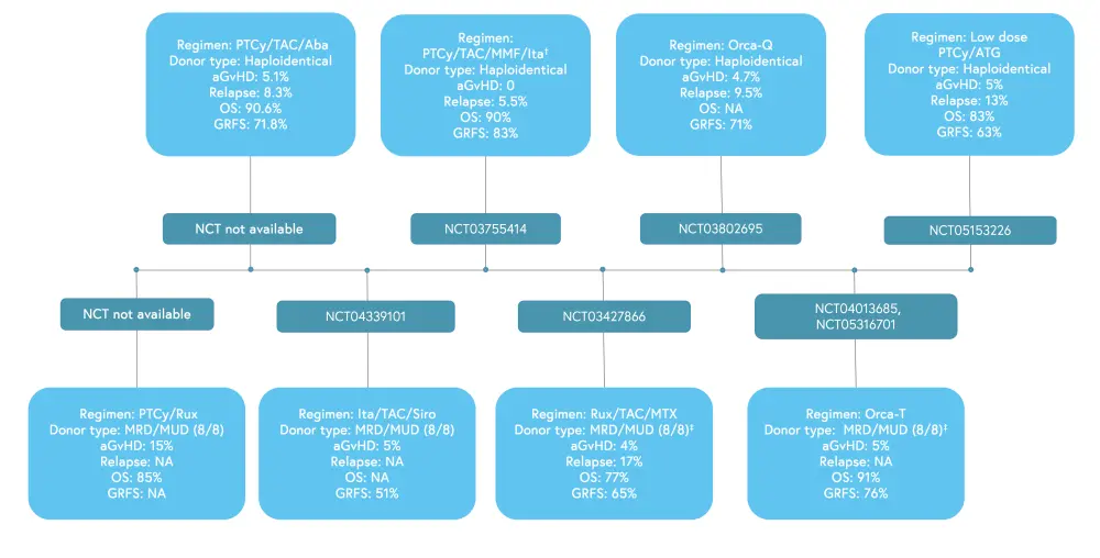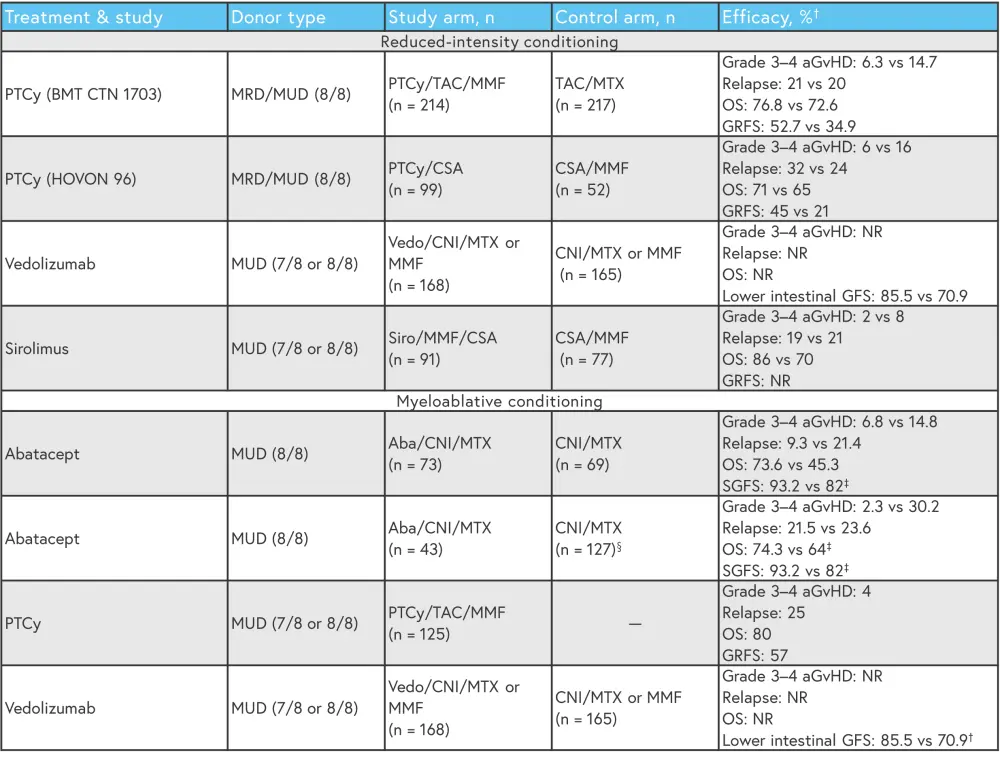 Aba, abatacept; aGvHD, acute graft-versus-host disease; ATG, antithymocyte globulin; GRFS, GVHD/relapse or progression-free survival; Ita, itacitinib; MMF, mycophenolate mofetil; MTX, methotrexate; MRD, matched-related donor; MUD, matched unrelated donor; NA, not available; OS, overall survival; PTCy, posttransplant cyclophosphamide; rux, ruxolitinib; Siro, sirolimus; TAC, tacrolimus.