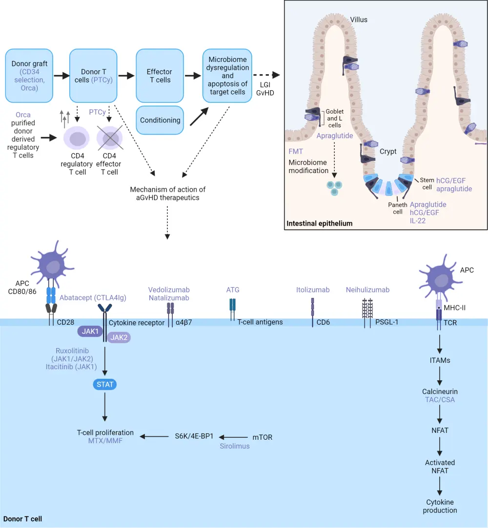 aGvHD, acute graft-versus-host disease; APC, antigen-presenting cell; ATG,antithymocyte globulin; CSA, cyclosporine; FMT, fetal microbiome transplantation; hCG/EGF, human chorionic gonadotropin/epidermal growth factor; IL-22, interleukin-22; JAK, janus kinase; LGI, lower gastrointestinal; MHC II, major histocompatibility complex II; MMF, mycophenolate mofetil; mTOR, mammalian target of rapamycin; MTX, methotrexate; NFAT, nuclear factor of activated T cells; PSGL-1, P-selectin glycoprotein ligand 1; PTCy,posttransplant cyclophosphamide; STAT, signal transducer and activator of transcription protein; TAC, tacrolimus; TCR, T-cell receptor