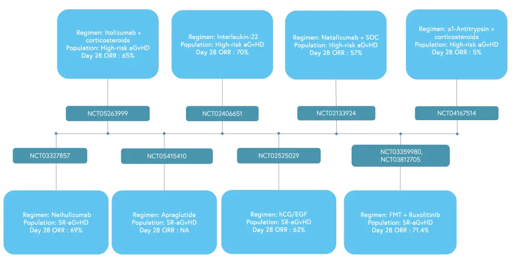 aGvHD, acute graft-versus-host disease; FMT, fetal microbiome transplantation; hCG/EGF, human chorionic gonadotropin /epidermal growth factor; NA, not available; ORR, overall response rate; SOC, standard of care; SR, steroid-refractory