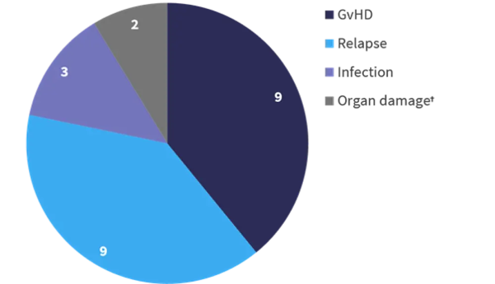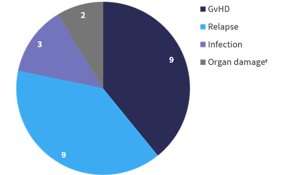 Overall, 52% of patients included on the trial died, with a median follow-up of 17 months. The breakdown for causes of death is shown in Figure 3; relapse and GvHD were the largest contributors to mortality.