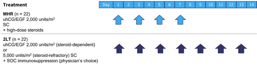 2LT, second-line treatment; EGF, epidermal growth factor; MHR, Minnesota high-risk; SC, subcutaneously; SOC, standard of care; uhCG, urinary-derived human chorionic gonadotrophin.