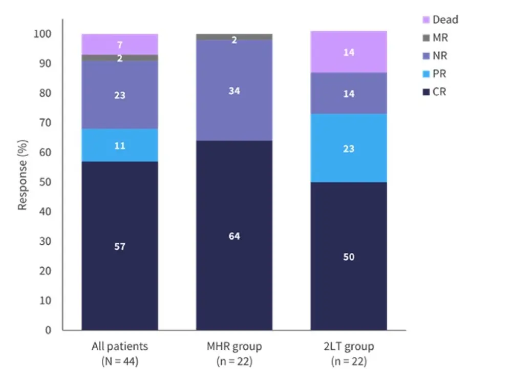 2LT, second-line treatment; CR, complete response; MHR, Minnesota high-risk; MR, minimal response; NR, no response; PR, partial response.