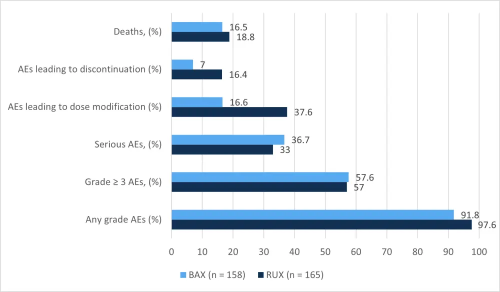 The safety profile of ruxolitinib was consistent with previous reports, with anemia and thrombocytopenia being the most frequent adverse events (AEs). While the majority of AEs were similar in incidence between the two treatment arms, anemia and thrombocytopenia were more common in the ruxolitinib group (Table 2).