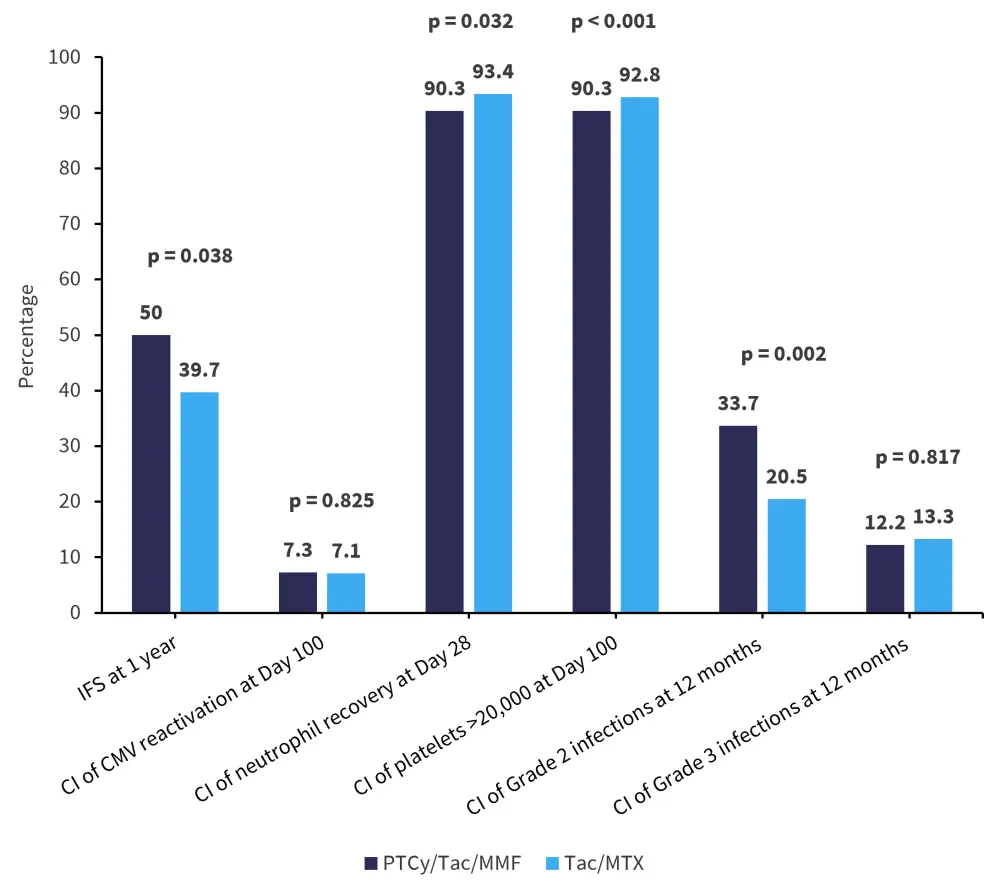 There were no differences in chimerism or rejection in the trial, with a graft rejection rate of 3% in the PTCy/Tac/MMF arm and 0.5% in the Tac/MTX arm. The most common cause of death was recurrent or persistent disease, affecting 39.6% of patients in the PTCy/Tac/MMF arm and 42.9% of patients in the Tac/MTX arm. Acute GvHD was a more common cause of death in the Tac/MTX arm (14.3%) compared with the PTCy/Tac/MMF arm (4.2%), whereas organ failure was a common cause of death in the PTCy/Tac/MMF arm (22.9%) compared with the Tac/MTX arm (10.7%).