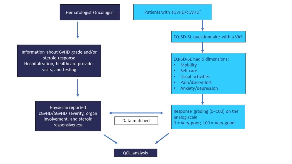 To assess the QOL of GvHD, data on disease severity and its impact on patients were collected from hematology-oncologists. Patients were also required to fill in the information using the EQ-5D-5L assessment tool. The EQ-5D-5L form consisted of a descriptive questionnaire and a visual analog scale (VAS) where patients could rate their QOL on a 7-point scale ranging from very good to very poor, and reported their current symptoms. These responses were analyzed by GvHD grade as per National Institutes of Health (NIH) criteria, and steroid response as reported by the physicians. An outline of the study method is presented in Figure 1.