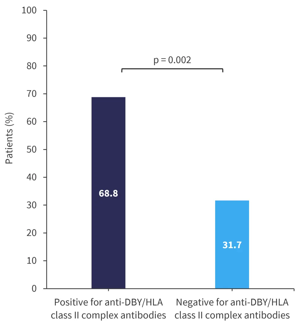 Plasma samples from 73 patients who received female-to-male HSCT were analyzed to determine if these antibodies can increase a patient’s risk of developing cGvHD. Of these patients, 43.8% were positive for anti-DBY/HLA class II complex antibodies, with the cumulative incidence of cGvHD higher in patients positive vs negative for these antibodies at 1 year (Figure 2).