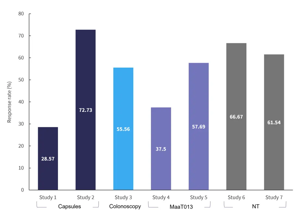 Response rates varied between the studies (Figure 1). Similar efficacy was seen in capsules, colonoscopy, and MaaT013, although patients treated through a nasoduodenal tube or nasogastric tube showed higher response rates.1 However, Goeser et al. stated that capsules led to less discomfort and improved safety compared with more invasive methods.2 It is important to note that there was an over-representation of FMT by nasoduodenal tube or nasogastric tube, so efficacy cannot be directly compared to other administration routes.