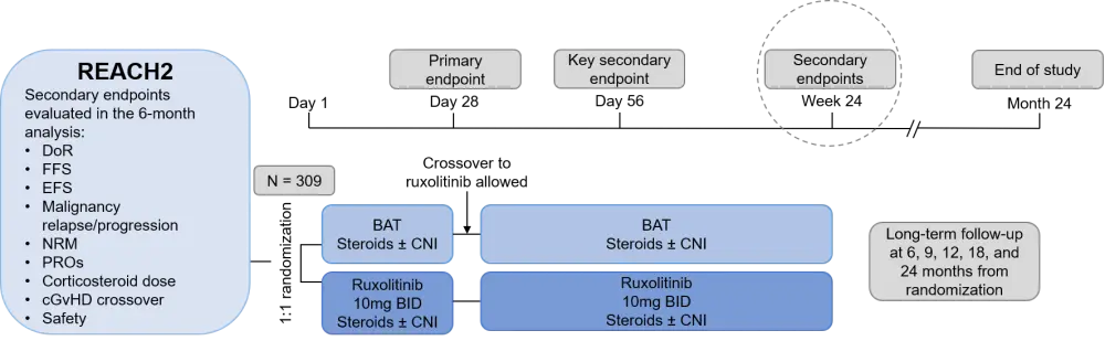 The 6-month follow-up of the REACH2 study highlights the sustained efficacy of ruxolitinib in patients with SR-aGvHD. Ruxolitinib demonstrated superior duration of response, failure-free survival, and event-free survival over BAT. Treatment with ruxolitinib also resulted in noticeable improvement in patient reported outcomes, and a lower probability of disease progression or the need for new systemic therapy for aGvHD. The safety profile of ruxolitinib in this setting was consistent with the primary analysis.