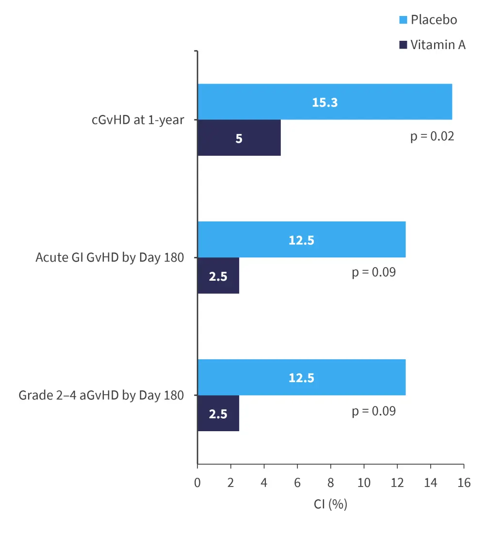 In the as-treated analysis, the incidence of Grade 1–4 aGvHD by Day 100 was 8% in the vitamin A cohort and 20% in the placebo cohort (p = 0.2). Below, Table 1 summarizes the cumulative incidence of GvHD in the as-treated analyses.
